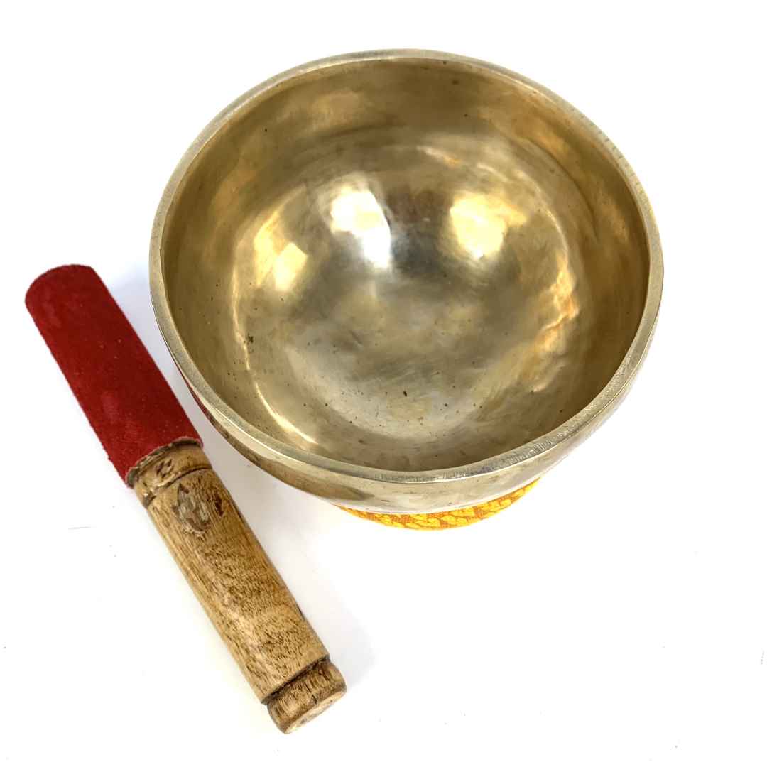 This bowl produces a rich, highly resonant tone with complex overtones. Strike the rim or side to explore different timbres, or gently circle the lip with the mallet to bring out the bowl’s sustained base note.