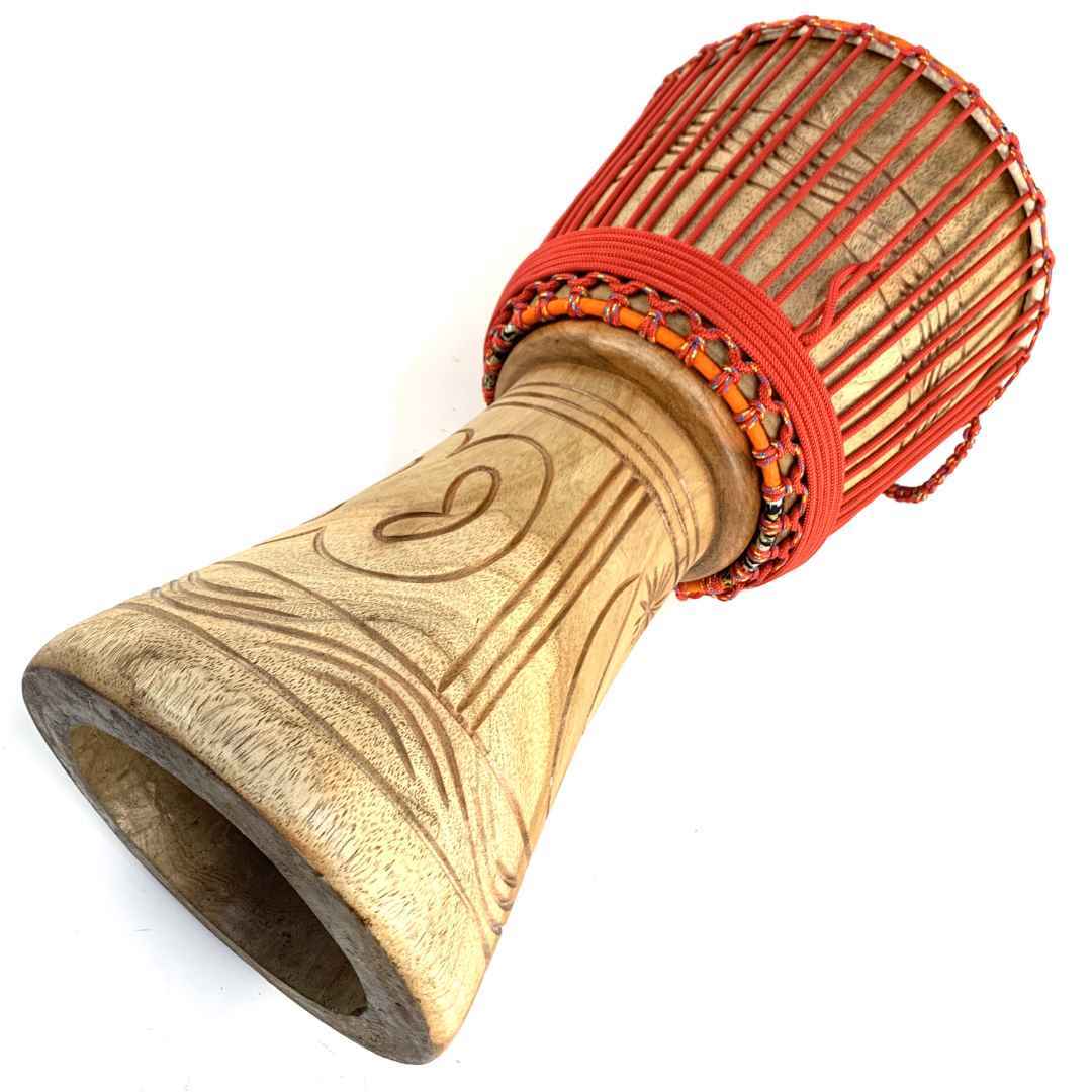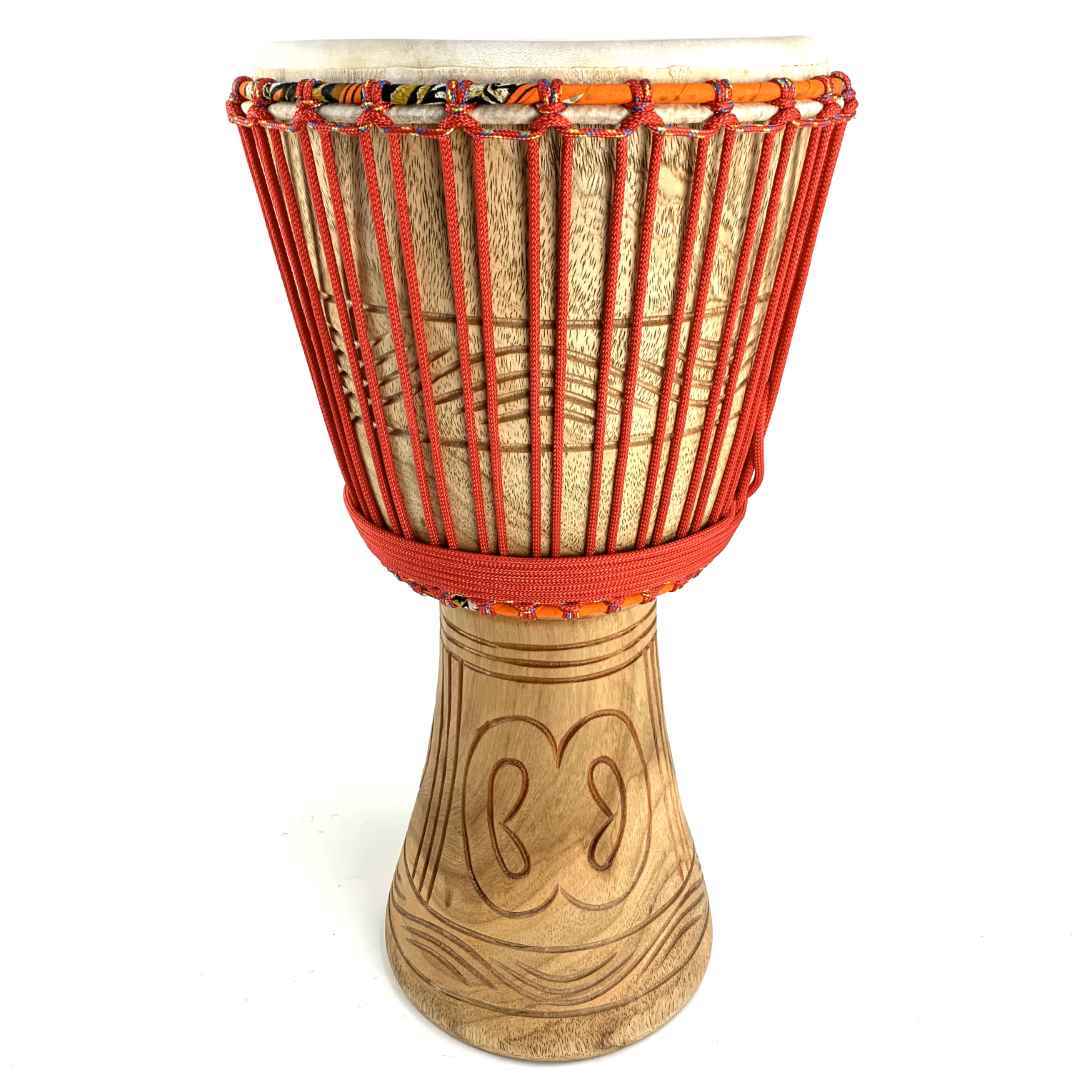 This Ghana Series djembe was carved from African Twenaboa. Twenaboa is a medium density timber, lighter than hardwoods. Super portable, great bass and range.