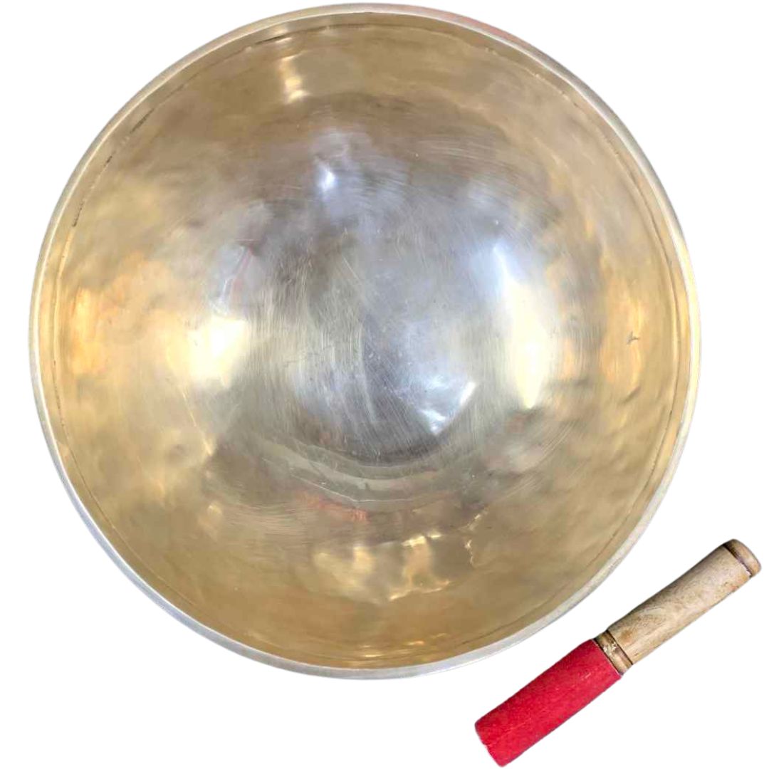 This bowl produces a rich, highly resonant tone with complex overtones. Strike the rim or side to explore different timbres, or gently circle the lip with the mallet to bring out the bowl’s sustained base note.