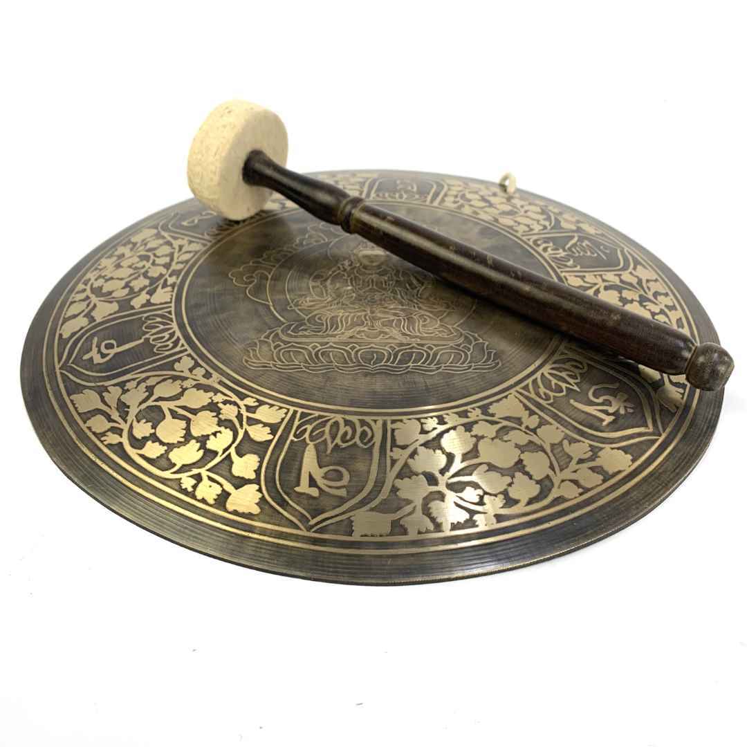 Hand-hammered Himalayan gong featuring a detailed deity design motif.